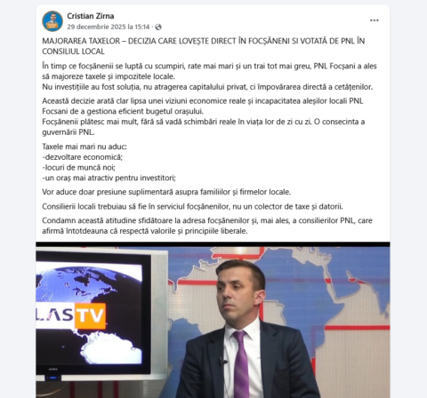 În penultima zi a anului trecut, Cristian Zîrnă a postat… Citește Fostul consilier local, Cristian Zîrnă, atacă PNL-ul pentru că liberalii au votat majorarea taxelor pentru focșăneni