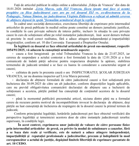 În legătură cu articolul publicat de Ediție de Vrancea aici,… Citește Drept la replică. Cum explică judecătoarea Zidărescu de la Tribunalul Vrancea faptul că a respins cererea de abținere a judecătoarei Alina Alexandru, în dosarul Natașa Simion vs. ISJ Vrancea.
