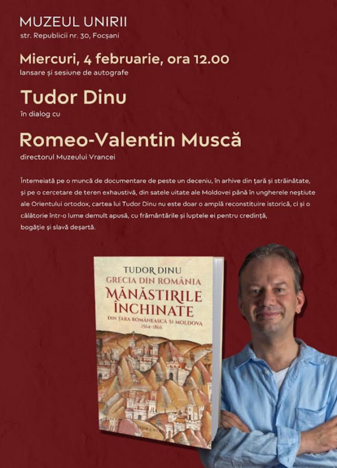 Muzeul Vrancei organizează miercuri, 4 februarie 2026, de la ora… Citește Grecia din România, un volum de Tudor Dinu prezentat la Muzeul Vrancei