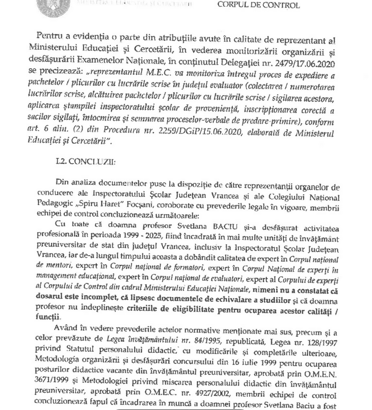 Astfel, decizia Consiliului de Administrație de la Pedagogic, de la sfârșitul lunii august, despre care Ediție de Vrancea a scris AICI, aceea de a înceta contractul individual de muncă al profesoarei Baciu, în contextul lipsei documentelor de la dosarul personal, a fost una corectă, documentată și foarte serioasă, confirmată acum chiar prin raportul Corpului de Control al Ministerului Educației.