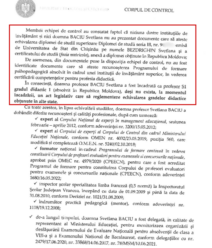 „Doamna profesor Baciu Svetlana a fost încadrată ca profesor gradul didactic I (absolvit în Republica Moldova), deși nu exista, la momentul încadrării, un act legislativ care să reglementeze echivalarea gradelor didactice obținute în alte state”, se arată în raportul Corpului de Control.