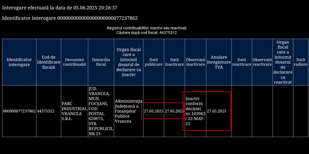 Activitatea Parcului Industrial Vrancea (PIV) a fost suspendată în urma declarării ca inactivă a societății deținute de Consiliul Județean Vrancea de către organul fiscal (mai exact de către Administrația Județeană a Finanțelor Publice Vrancea), la cererea administratorului PIV Nelu Bucur, numit de președintele CJ Nicușor Halici în funcția respectivă.