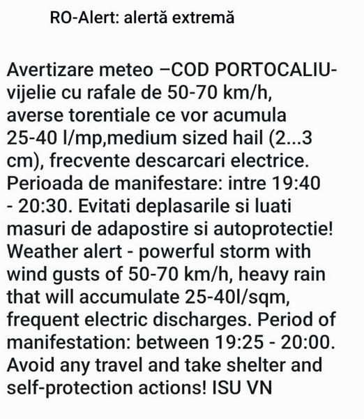 Posted in Eveniment Acum. Ro Alert la Focșani. Vijelie cu rafale. Un copac a căzut peste o mașină în Sud. EditiedeVrancea 22/08/2025 Leave a Comment on Acum. Ro Alert la Focșani. Vijelie cu rafale. Un copac a căzut peste o mașină în Sud. 0 376 Mesaj Ro Alert la Focșani astăzi între 19.40 și 20.30. Evitați deplasările inutile! https://editiedevrancea.ro/wp-content/uploads/2025/08/video-grindina-la-Focsani.mp4 Ediție de Vrancea Online Știri din Vrancea, actualizate constant. Vizitează pagina PROMO