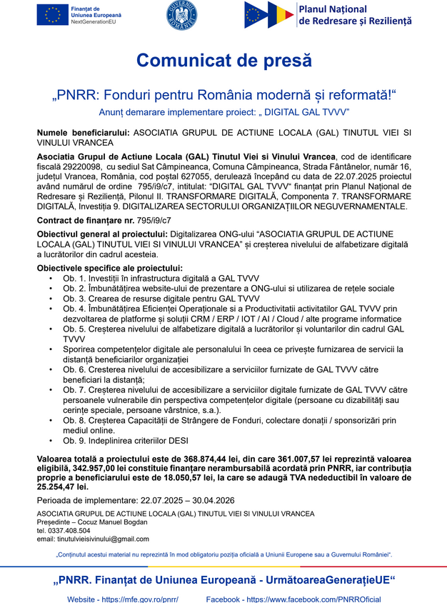 Posted in Eveniment Anunț demarare implementare proiect: „Digital GAL TVVV” EditiedeVrancea 01/09/2025 Leave a Comment on Anunț demarare implementare proiect: „Digital GAL TVVV” 0 37 Ediție de Vrancea Online Știri din Vrancea, actualizate constant. Vizitează pagina PROMO