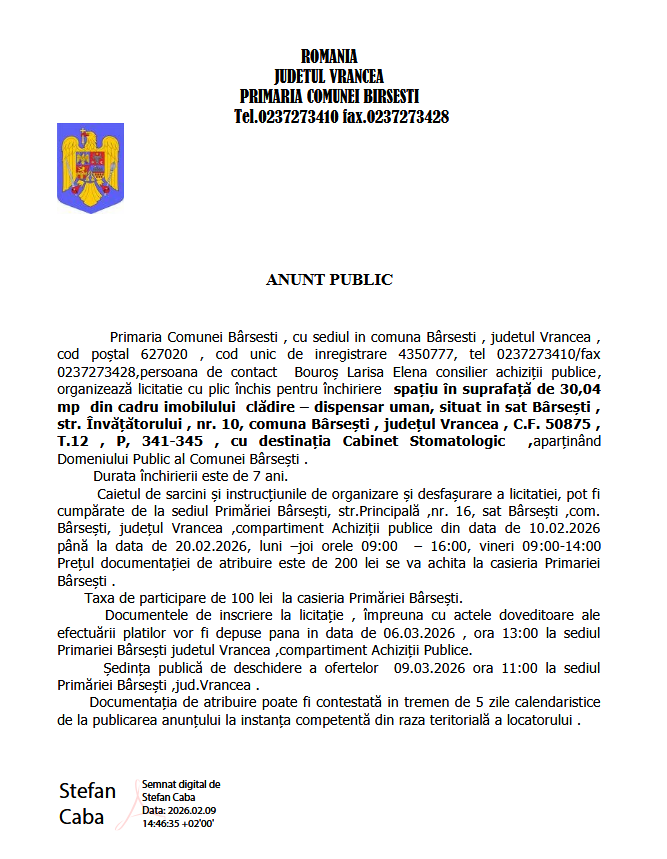 Posted in Anunțuri Anunț privind organizarea unei licitații pentru închiriere spațiu cu destinația cabinet stomatologic în comuna Bîrsești EditiedeVrancea 09/02/2026 Leave a Comment on Anunț privind organizarea unei licitații pentru închiriere spațiu cu destinația cabinet stomatologic în comuna Bîrsești 0 119 Ediție de Vrancea Online Știri din Vrancea, actualizate constant. Vizitează pagina PROMO