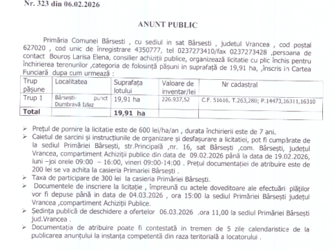Posted in Anunțuri Anunț public. Primăria Bârsești organizează licitație cu plic închis pentru închirierea unor terenuri EditiedeVrancea 04/04/2025 Leave a Comment on Anunț public. Primăria Bârsești organizează licitație cu plic închis pentru închirierea unor terenuri 0 419 Ediție de Vrancea Online Știri din Vrancea, actualizate constant. Vizitează pagina PROMO