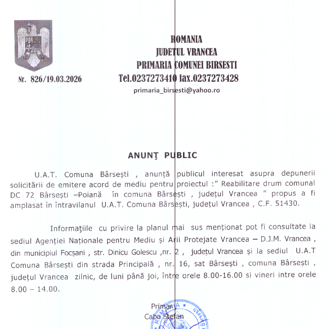 Posted in Administrație, Anunțuri Anunț. Solicitare emitere acord de mediu pentru proiectul „Reabilitare drum comunal DC 72 Bârsești – Poiană, jud. Vrancea” EditiedeVrancea 19/03/2026 Leave a Comment on Anunț. Solicitare emitere acord de mediu pentru proiectul „Reabilitare drum comunal DC 72 Bârsești – Poiană, jud. Vrancea” 0 51 Ediție de Vrancea Online Știri din Vrancea, actualizate constant. Vizitează pagina PROMO