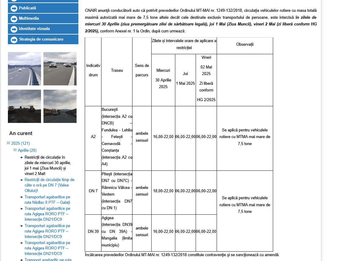 CNAIR anunţă conducătorii auto că potrivit prevederilor Ordinului MT-MAI nr. 1249-132/2018, circulaţia vehiculelor rutiere cu masa totală maximă autorizată mai mare de 7,5 tone altele decât cele destinate exclusiv transportului de persoane, este interzisă în zilele de miercuri 30 Aprilie (ziua premergătoare zilei de sărbătoare legală), joi 1 Mai (Ziua Muncii), vineri 2 Mai (zi liberă conform HG 2/2025), conform Anexei nr. 1 la Ordin, după cum urmează: