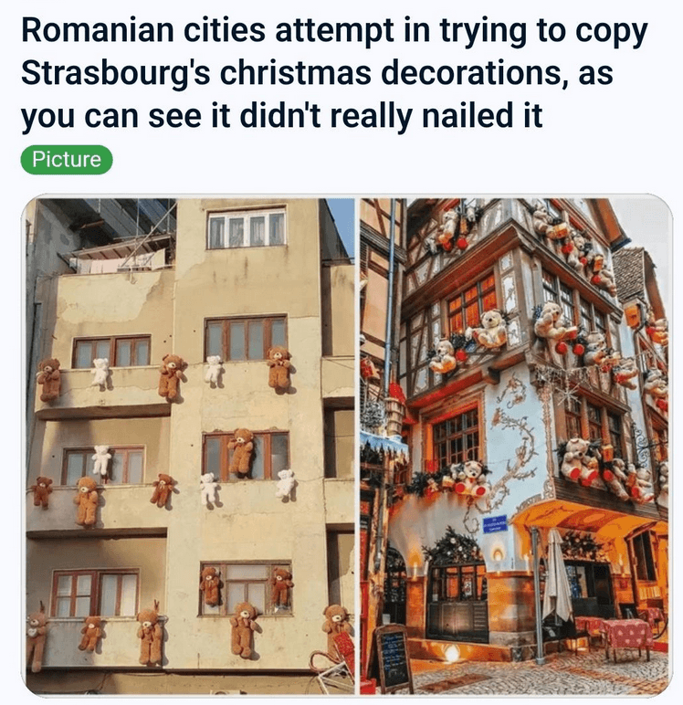 Primăria Focșani a încercat să imite decorațiunile de Crăciun din Strasbourg (Franța) – vezi foto jos – însă a ieșit un decor macabru, cu ursuleți care par spânzurați. Încă o dată, Misăilă și oamenii săi se fac de râs. Au o scuză, totuși: „Dacă nu e, nici Dumnezeu nu cere”…