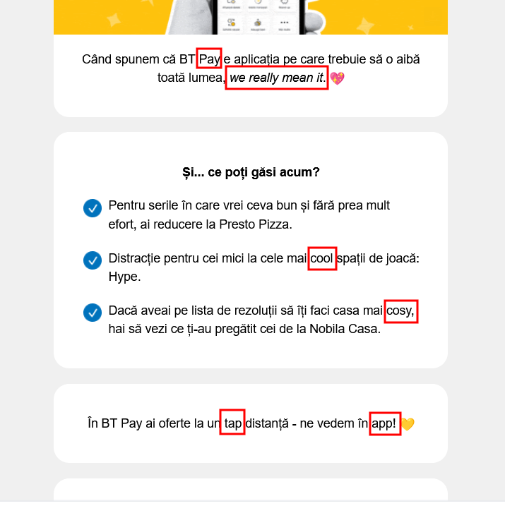 Banca Transilvania pășește rapid și sigur spre penibil, „îngrămădind” o mulțime de cuvinte englezești într-un mesaj în… limba română. Da, suntem deschiși („open mind” 😀 ) dar la fel suntem de realiști când spunem că se exagerează și ce e cam mult… e prea mult. Și ne mai mirăm de ce copiii noștri nu mai vorbesc așa cum este firesc și natural…