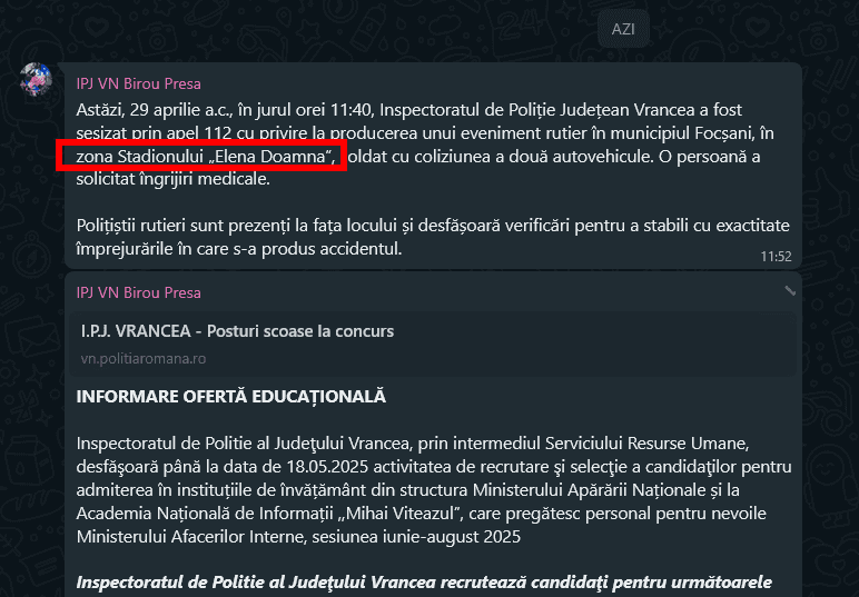 Posted in Eveniment Biroul de Presă al IPJ Vrancea a inventat un nou stadion în Focșani: Stadionul… „Elena Doamna”. :) EditiedeVrancea 29/04/2025 Leave a Comment on Biroul de Presă al IPJ Vrancea a inventat un nou stadion în Focșani: Stadionul… „Elena Doamna”. :) 0 704 De fapt, stadionul se numește ”Tineretului” (fost „23 August”) și se află pe strada Cuza Vodă… Ediție de Vrancea Online Știri din Vrancea, actualizate constant. Vizitează pagina PROMO