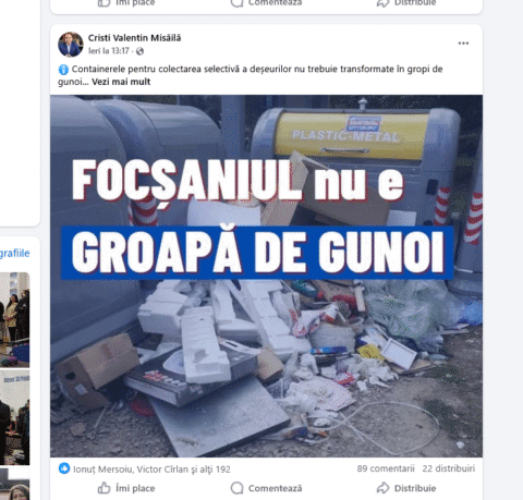 Gafă de proporții a primarului de Focșani. În loc să… Citește Misăilă se plânge că lumea pune gunoi lângă containerele sigilate, deși Primăria le-a montat înainte să se asigure că vor putea fi folosite.