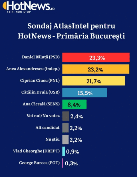 Sondaj realizat pentru Hotnews de către Atlasintel. Trebuie privit cu… Citește Sondaj dubios pentru Primăria București. Cap la cap între cei trei candidați favoriți.