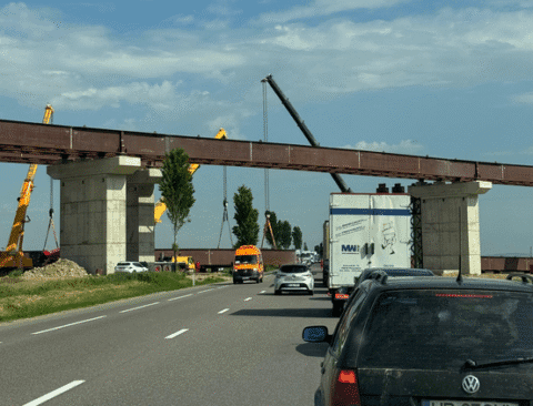 Foto: Calm și răbdare în trafic. Pe drumul național spre Adjud se montează grinzi la podul autostrăzii.
