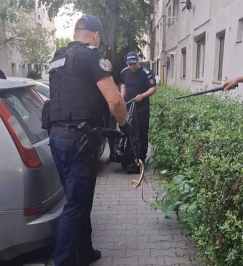 Alarmă în Focșani, pe Aleea Stadionului. Un șarpe a fost capturat de jandarmi. Se ascundea în bălăriile de care Primăria Focșani nu se ocupă.