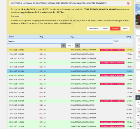 Specialiștii INFP au anunțat aseară producerea unui cutremur de 4,1… Citește Cutremurul de 4,1 grade, de aseară, în limitele normale. Peste 100 de cutremure s-au produs în ultimele 2 luni în zona seismică Vrancea.