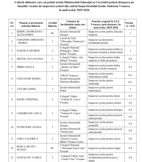Cadrele didactice care au primit avizul Ministerului Educației și Cercetării… Citește ISJ Vrancea a anunțat lista noilor inspectori școlari din Vrancea pentru anul școlar 2025 – 2026
