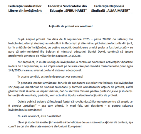„Federația Sindicatelor Libere din Învățământ (FSLI), Federația Sindicatelor din Educație… Citește Sindicatele din învățământ: „Pe 8 septembrie vom ieși în stradă pentru viitorul educației și pentru viitorul României”
