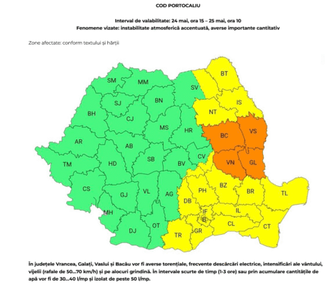 Acum s-a anunțat. Vijelii, ploi torențiale și grindină în Vrancea. Cod Portocaliu până diseară. Posibile inundații în anumite zone din județ.