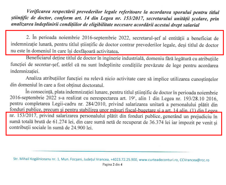 Un raport al inspectorilor de la Curtea de Conturi Vrancea care au verificat situația secretarei-șefe de la Colegiul Pedagogic, Paulina Roșcan (foto dreapta, degrevată în prezent de sarcini pentru că