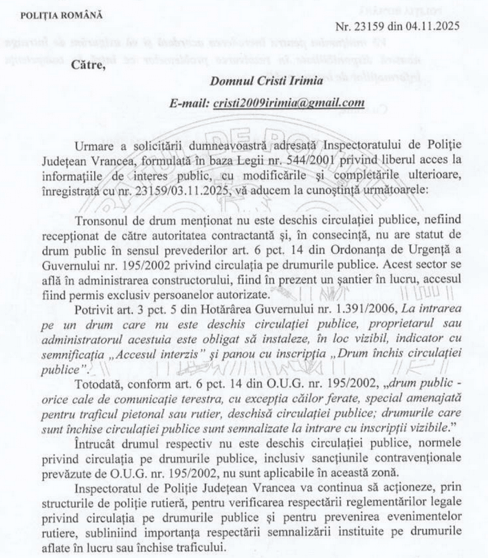 În altă ordine de idei, Biroul de Presă al IPJ Vrancea a trimis redacției următorul punct de vedere cu privire la situația în cauză: