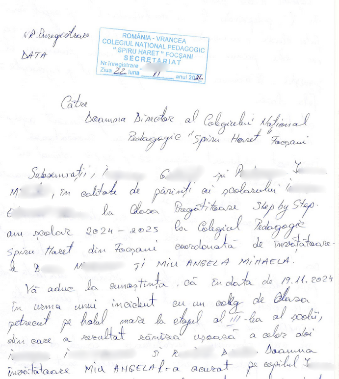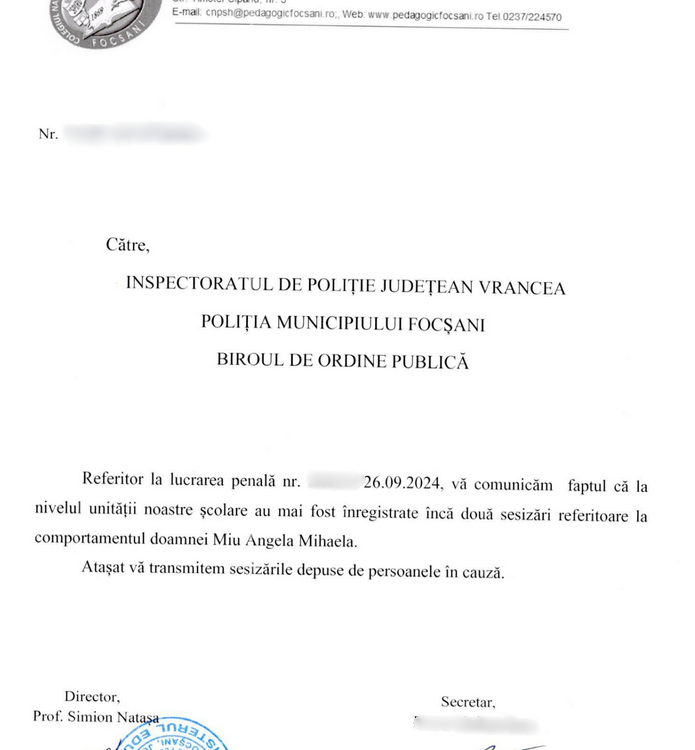 Colegiul Național Pedagogic din Focșani a trimis și o adresă la IPJ Vrancea, în care a precizat că pe numele Angelei Miu există alte două plângeri pentru lovirea unor copii.
