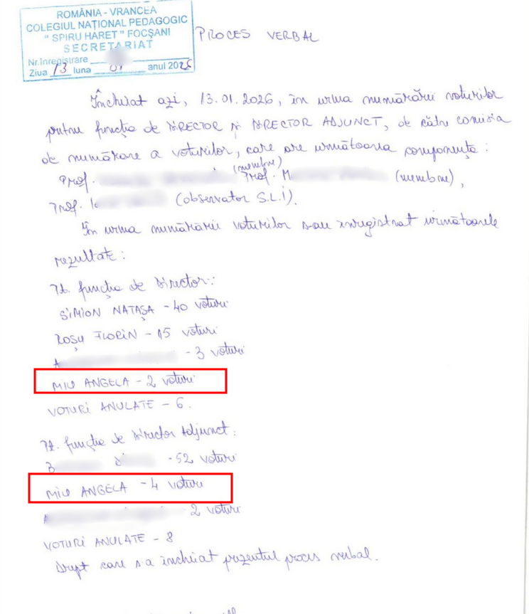 În acest context, poate că ar fi fost corect și transparent ca ISJ Vrancea să explice măcar profesorilor de la Pedagogic, dacă nu și publicului larg, care au fost criteriile care au stat la baza nominalizării Angelei Miu ca director adjunct, în condițiile în care a existat o profesoară de la Colegiul Pedagogic care a primit 52 de voturi ale colegilor pentru a fi director adjunct.