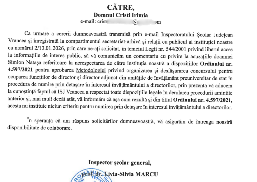 Într-un răspuns adresat ziarului nostru legat de metodologia privind desemnarea directorilor prin detașare, ISJ Vrancea susține că a respectat „toate dispozițiile legale” și că „Ordinul 4597/2021 nu instituie niciun criteriu pentru numirea prin detașare în interesul învățământului a directorilor”.