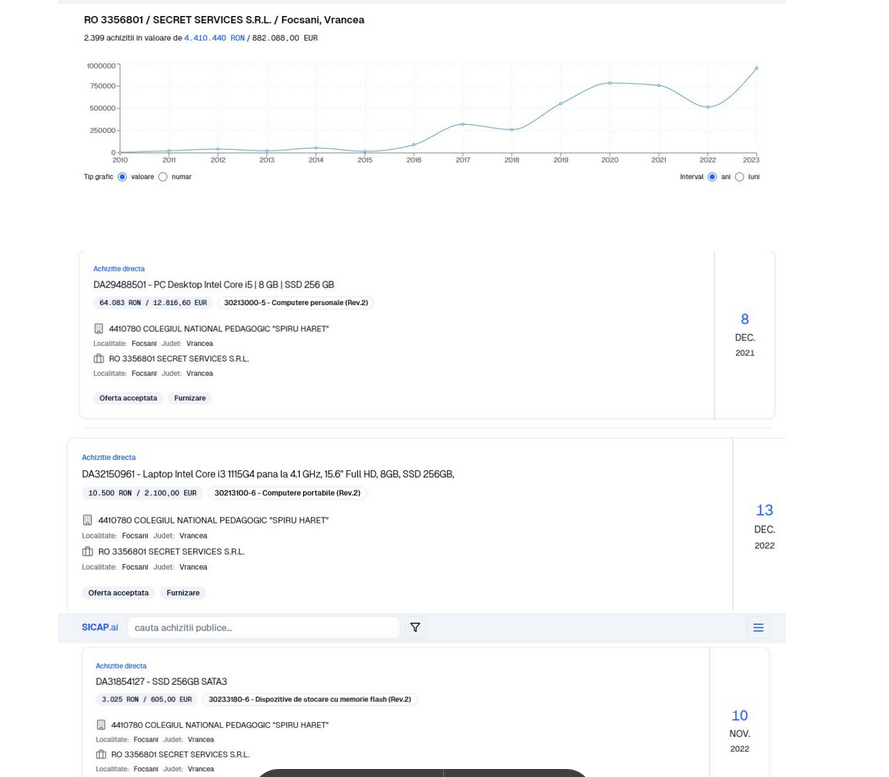 Pe portalurile de specialitate, firma Secret Services SRL apărea recent cu peste 2.000 de contracte / licitații directe primite / câștigate însumând aproape 900.000 de euro. Evident, nu toate erau cu ISJ-ul sau cu Pedagogicul și se întindeau pe mai mulți ani.