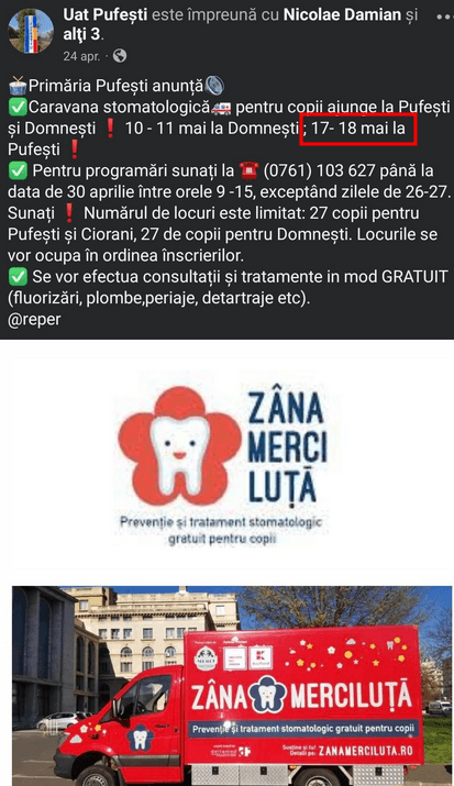 Primarul PSD de la Pufești, Nicolae Damian, s-a… „orientat” și a băgat o caravană medicală fix în ziua votării (turul 2), pe 18 mai. Pură coincidență, desigur 😀