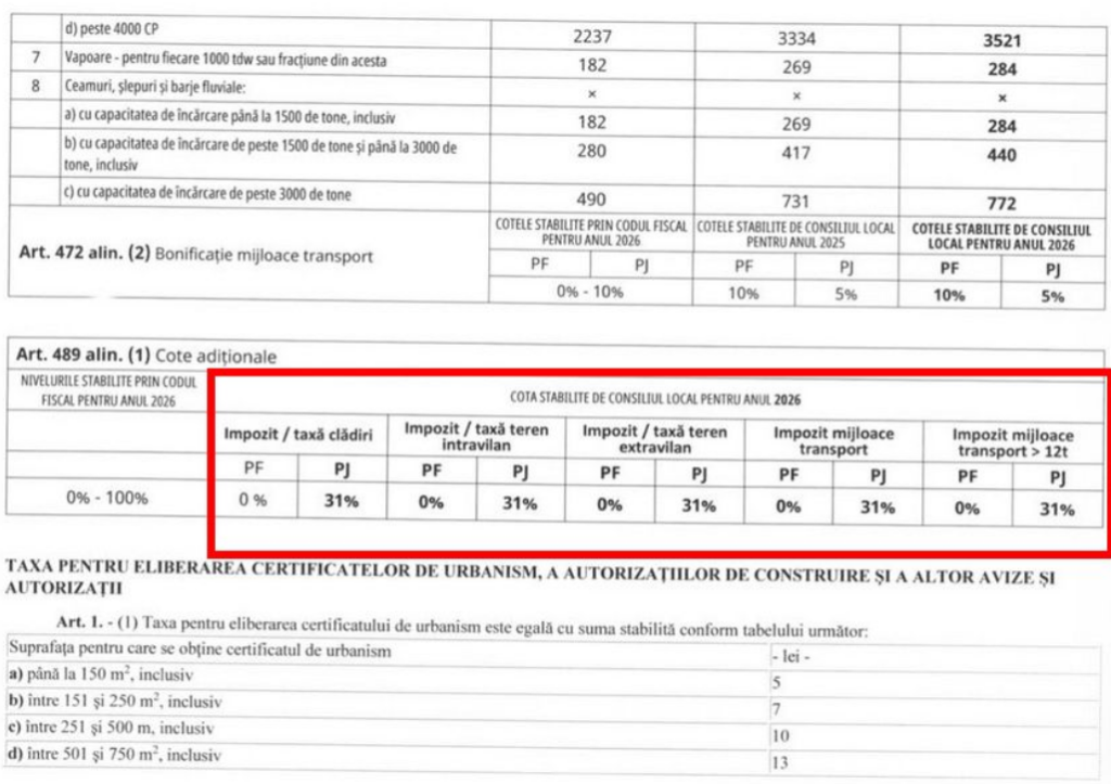 Ei cer acum, practic, același tratament pe care Primăria Cotești l-a aplicat persoanelor fizice. „Impozitul legal se calculează între 0,2 % și 1,3 %, iar noi nu am cerut reduceri sub pragul legal, ci doar aplicarea cotei maxime prevăzute de lege, 1,3 %, la fel ca în toate celelalte municipii și orașe din județ: Focșani, Odobești, Adjud, Mărășești, precum și în celelalte comune din Vrancea. Am ajuns să primim decizii de zeci de mii de euro impozit anual. Vom cere revizuirea de urgență a hotărârilor privind suprataxarea persoanelor juridice și alinierea acestora la cota maximă prevăzută de Codul Fiscal, așa cum s-a procedat deja în cazul persoanelor fizice, suprataxate și ele ani la rând”, ne-a declarat unul dintre oamenii de afaceri afectați de suprataxare. (Cristi IRIMIA)