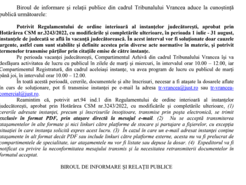 Restricțiile de circulație, sunt valabile în perioada 13-14 iulie a.c., în intervalul orar 10:00 – 20:00, pe toate sectoarele de drum național din județul Vrancea.