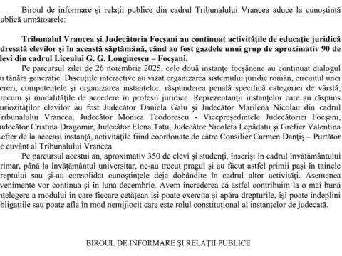 Aici va activa Secția Contencios Administrativ și Fiscal a Tribunalului Vrancea, parțial începând din 11 august și integral de la 1 septembrie: