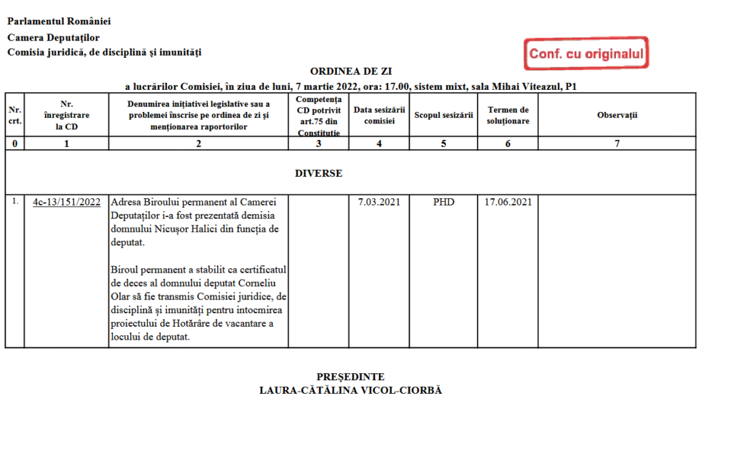 În documentele publice postate pe site-ul Camerei deputaților Laura Vicol apare ca președinte al Comisiei juridice pentru prima dată abia pe 2 decembrie 2021, așadar la un an după demisia lui Halici. Acesta apare în fișierele de pe site-ul Cdep.ro semnând documente în calitate de vicepreședinte la finalul lui decembrie (pe 21), când Laura Vicol a absentat de la ședința Comisiei juridice, iar aceasta a fost condusă de Halici.