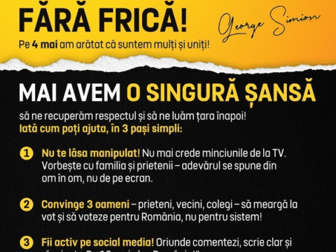 Am încheiat cu un mesaj clar: viitorul aparține patrioților. Așa cum au luptat strămoșii mei pentru libertate, așa voi lupta și eu pentru ca România să fie o țară liberă, puternică, demnă și respectată”, a precizat George Simion.